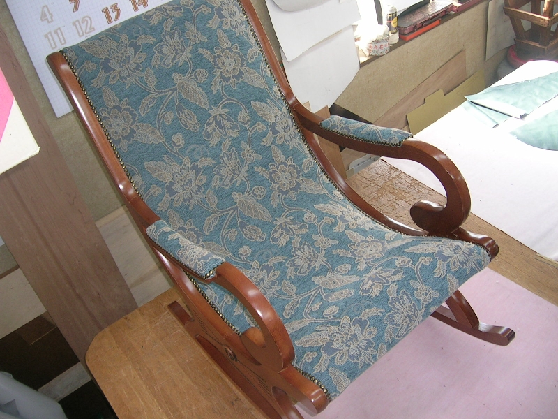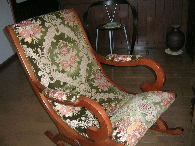 ロッキングチェアーです。どんなタイプの椅子も張替えが可能なことがあります。どうぞご相談ください。